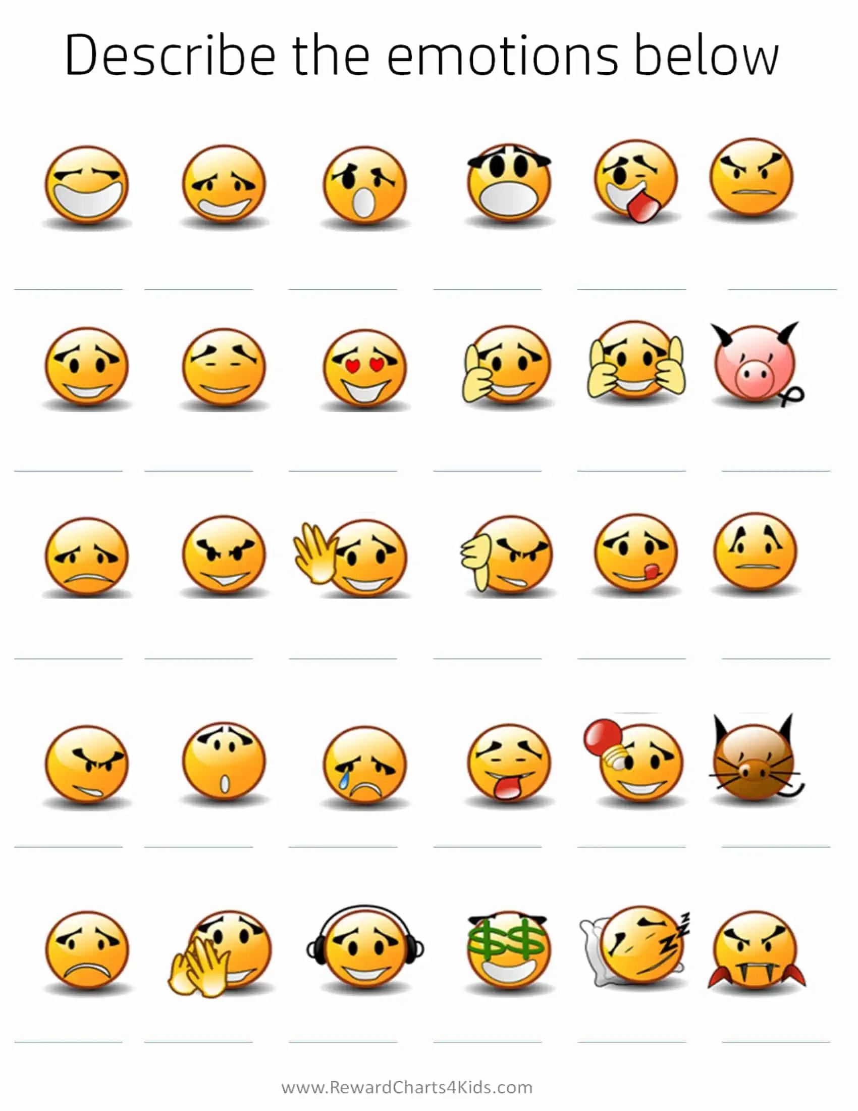 Each of the feelings faces is expressing a different emotion. Add a suitable emotion word for each of the feeling faces. This will help children learn how to define types of emotions and use words to express themselves.