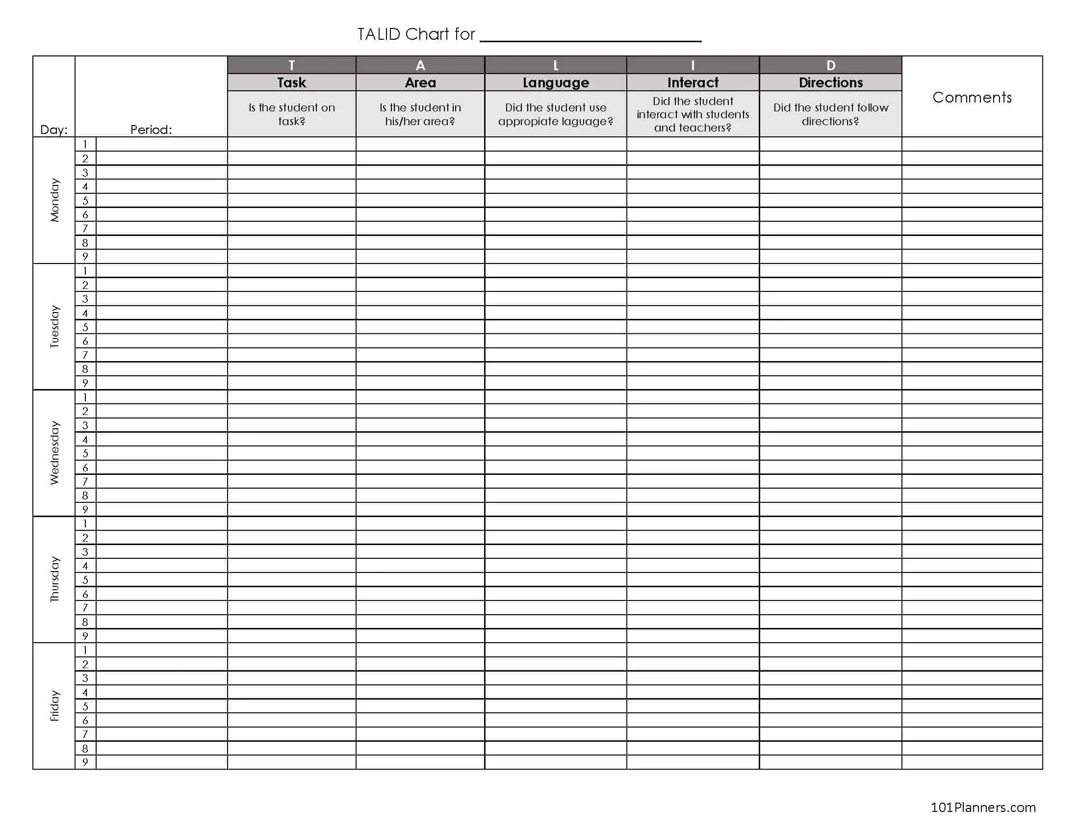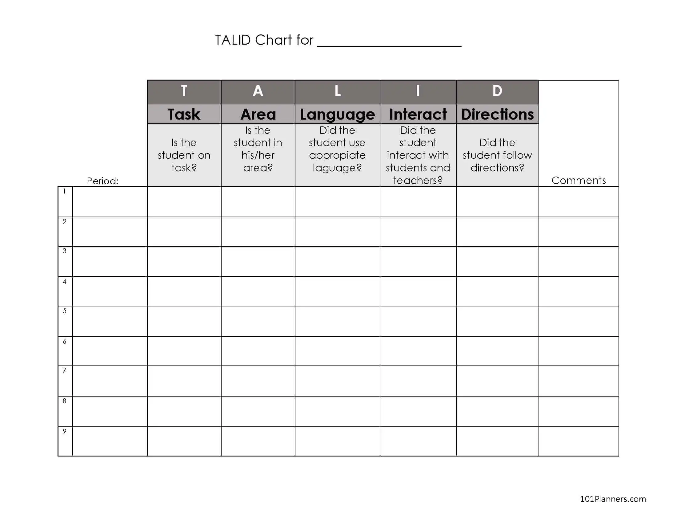 Many teachers use a TALID chart but these charts can be modified based on any school-wide positive behavior support plans or the age of the student. The language can be simplified. Most of these behavior charts follow on the ability to comply, safe behavior, and following the directions in the classroom. When the student reaches a certain level or point value they will receive a reward.