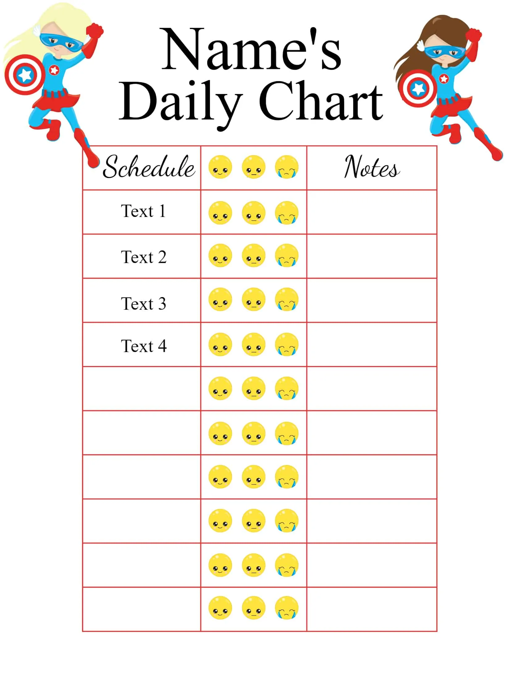 Free printable daily behavior chart template you can customize before you print. You can change the background, clipart, and chart layout on each template. Either add a daily schedule to break up the day into sections or add specific goals for each day.