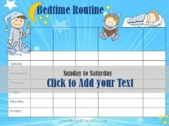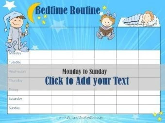 We offer a standard bedtime routine chart with six tasks before bedtime. You can also use our online chart maker to make your own bedtime chart with your specific routine. This will also enable you to use the terminology that your child is used to, whether it is “go potty,” “go to the toilet,” or whatever term you want to use.