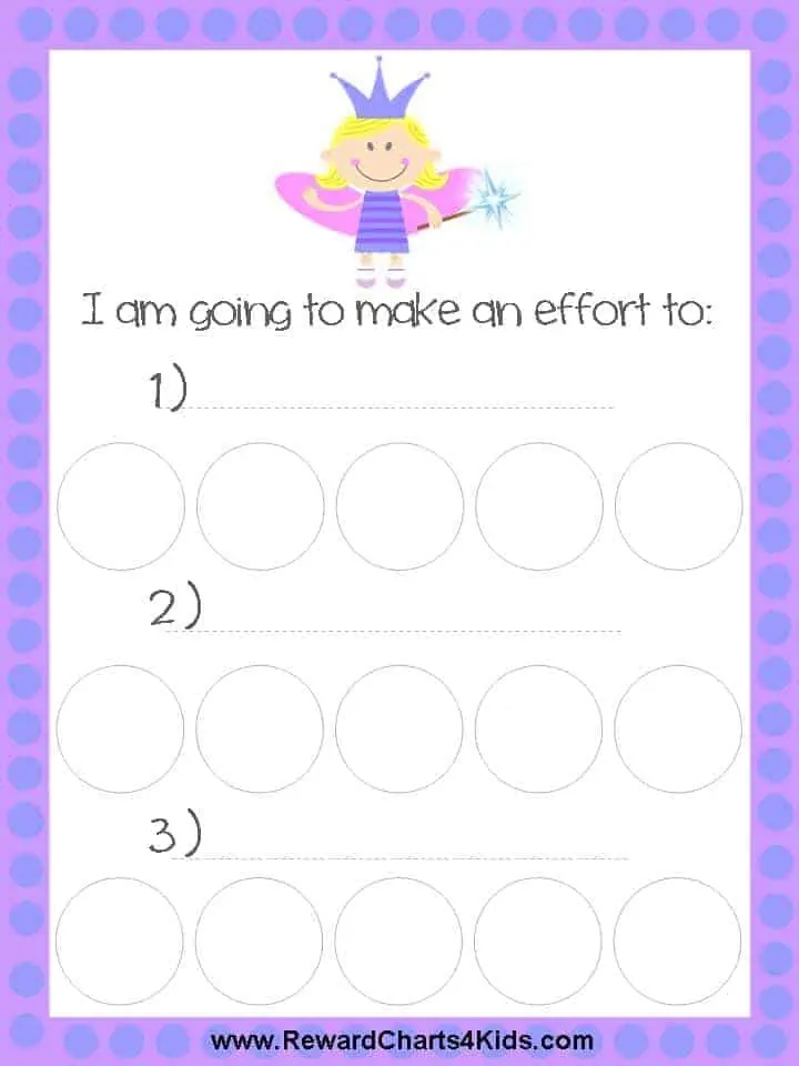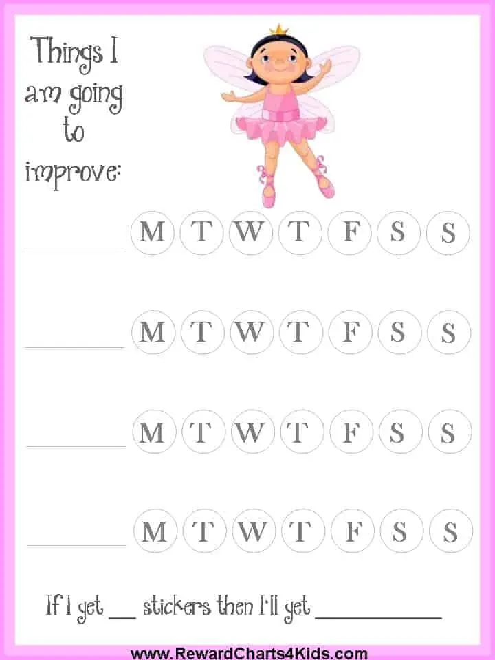 A selection of free printable fairy sticker charts to keep track of your daughter’s or student’s behavior. Each sticker chart has space to record personal goals and things that she will work on each week. Once she reaches these goals, she will get a sticker for that particular goal. Decide on the prize for achieving all goals ahead of time. There is a section on the chart to record the prize. This will keep her motivated. In the beginning, the change of behavior might be to win this prize, but eventually, this good behavior becomes a habit, and she will enjoy the praise and the benefits of behaving well.