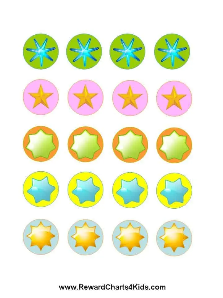 Every time your child earns a sticker, put a piece of gum in the gumball machine. This pack comes with a blank sticker chart (i.e. an empty gumball machine) and colored gum stickers. If you have colored dot stickers, you might find them easier to use since you won’t have to bother printing them or cutting them out.
